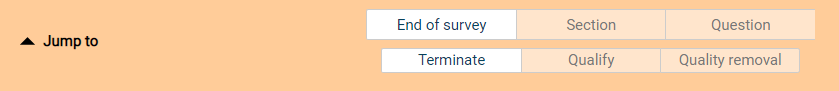 サーベイの最後にジャンプさせると、回答者のステータスを「Terminate」、「Qualify」、または「Quality Removal」の中から選択できます。