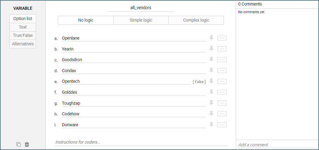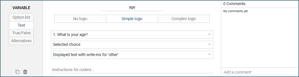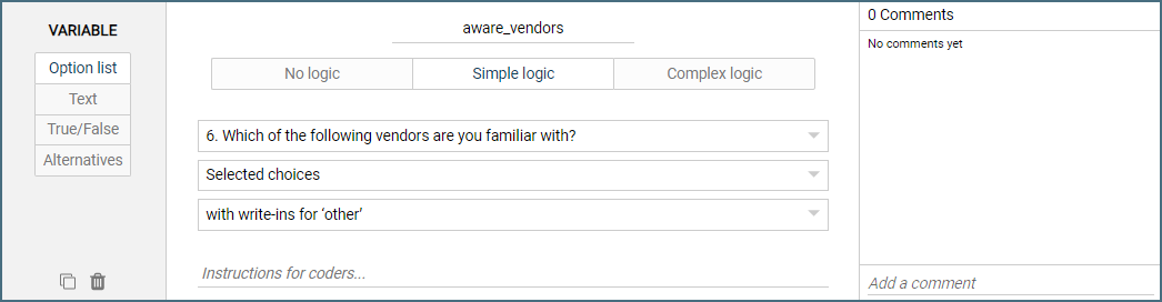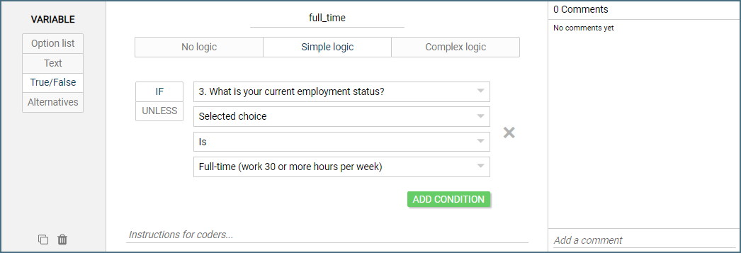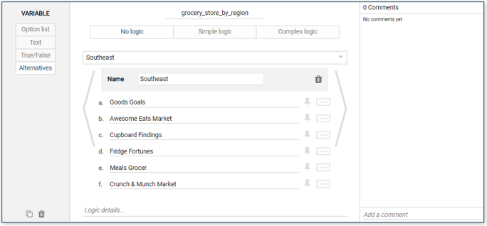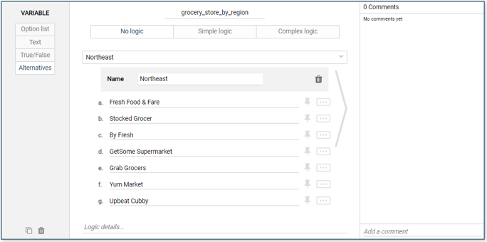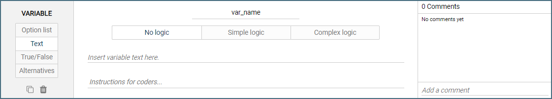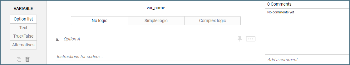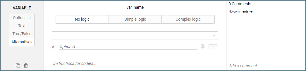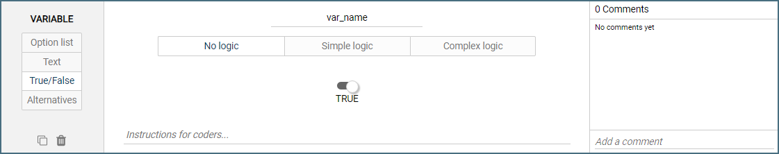 各変数は、No logic, Simple logic, または Complex logicで定義できます。これらのオプションは、要素の中央部分で選択可能です。