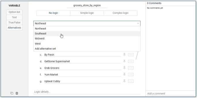 Alternatives - Alternatives - この変数タイプは、複数のOption List変数が1つになったような、リストのテーブルのように機能します。地域固有のベンダー、メーカーとモデルのリスト、および他の類似の構造化されたデータに便利です。異なるセットは、中央のドロップダウンメニューからアクセスできます。