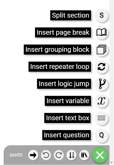 텍스트 상자 삽입하기(Insert text box) - 설문조사에 텍스트 상자를 추가합니다. 내부의 메모, 응답자가 읽을 텍스트 또는 코더 지시 사항을 위해 사용할 수 있습니다.