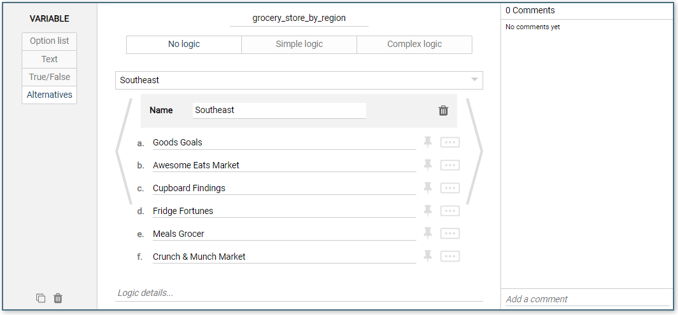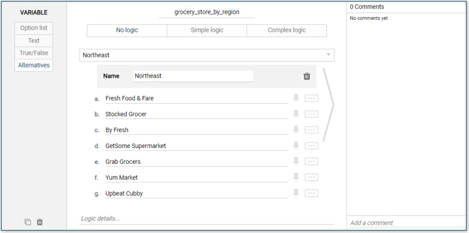 로직 없음(No logic), 옵션 목록 변수의 예시: