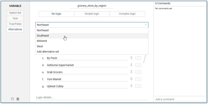 대체(Alternatives) - 이 변수 유형은 다수의 옵션 목록 변수가 하나로 된 것처럼 목록 표로 간주될 수 있습니다. 지역적으로 특정한 벤더, 목록을 만들고 모델을 만드는 것, 다른 비슷하게 구성된 데이터에 유용합니다. 중앙에 있는 드롭다운 메뉴 또는 왼쪽/오른쪽 화살표를 통해 다른 세트에 접근합니다.