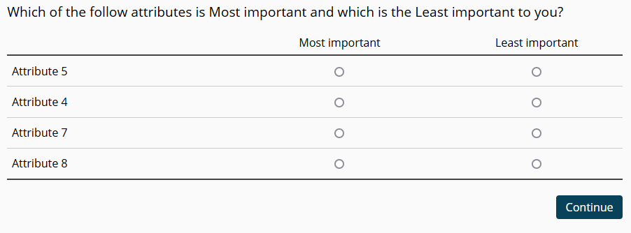 回答者は、ある属性を「最も重要」、別の属性を「最も重要でない」と選択し、別の基準で再度同じ説問をします。