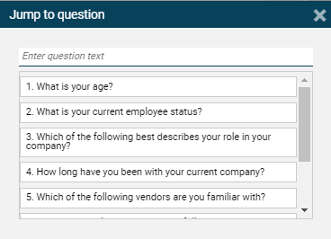 | Jump to Question (see below) - This dialog allows you to search the survey by question number or text and quickly jump to the location of interest. |