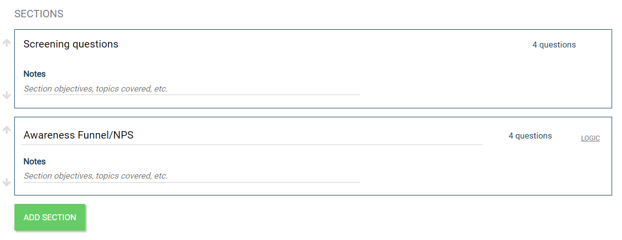 From this area you can add, move, rename, or set logic on sections. Note all of this functionality is available on the Content tab as well.
