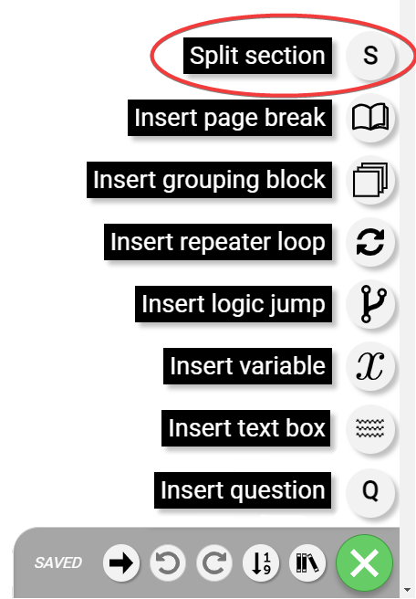 #5 - Delete icon - This will delete the section split. Note this will not delete all the questions/elements in the section it will delete the split section and merge the contents with the section above