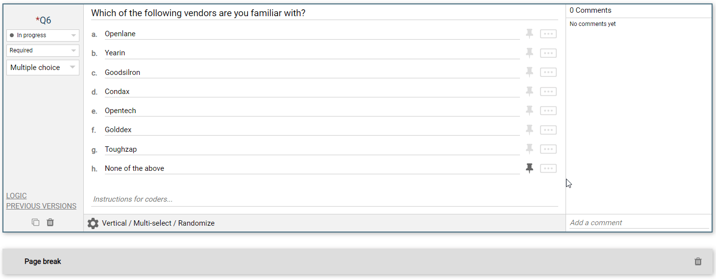 “以上都不是”(None of the above)选项适用于以下问题:多项选择题(仅限多选)、排名题、比重题、组合题、矩阵题类型(关于如何设置矩阵行或列的排他性,请询问 IncQuery 团队)。