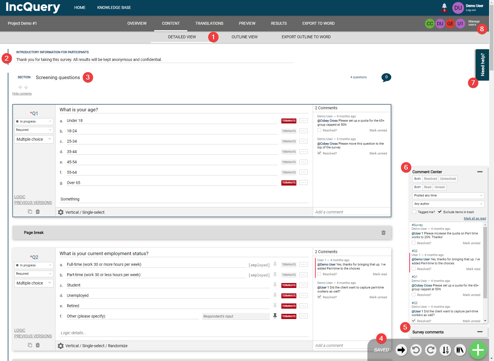 内容选项卡是您进行调查编写的地方。调查项目中,您将主要在此选项卡上编辑。