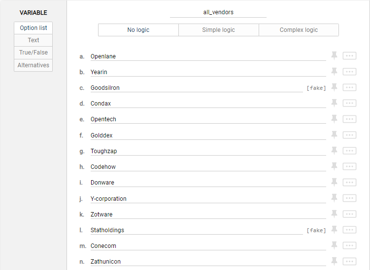 标记的另一个用法,是用来标记虚假供应商。在下面的示例中,标签被添加到变量中的某些选项中。