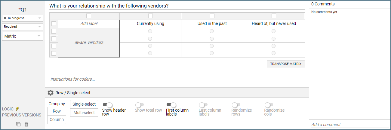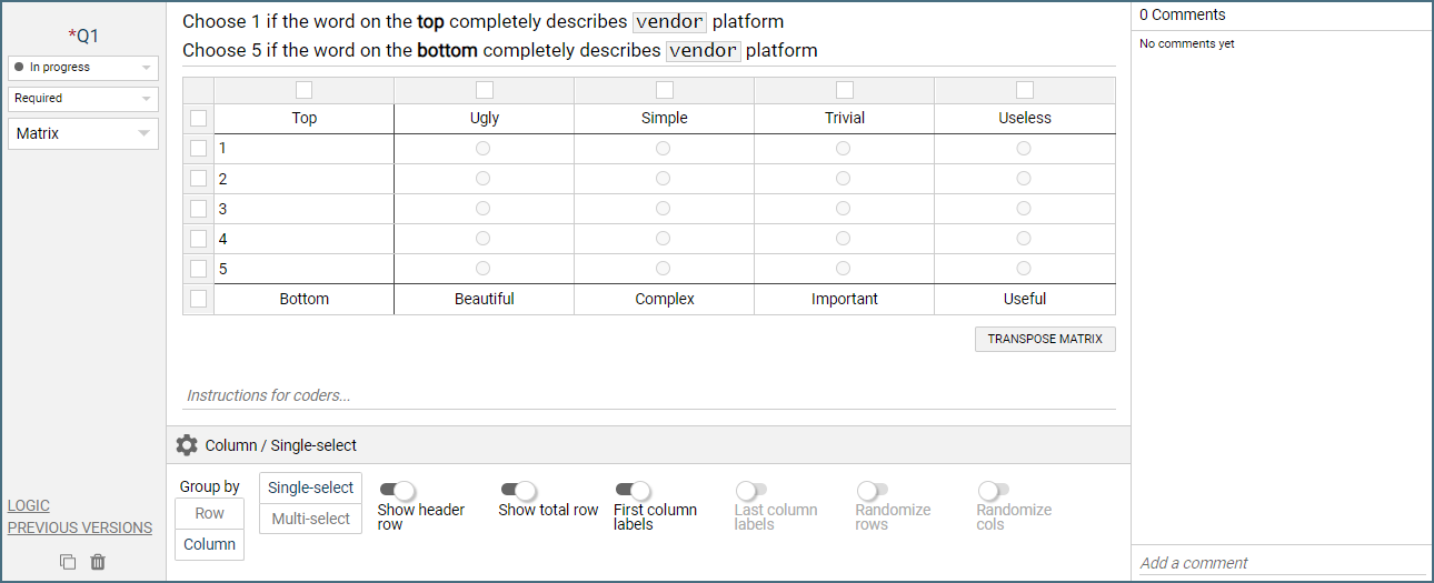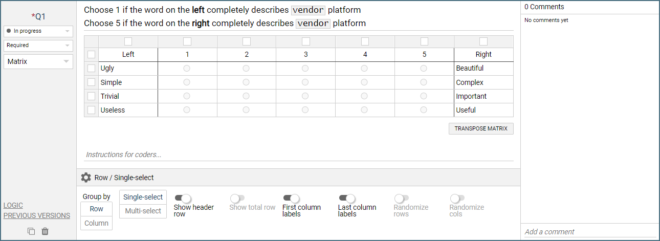 最后一列标签(Last column labels) - 点击该按钮以创建双极矩阵问题。这种设置最常用于比较相反的情绪陈述(好/坏、浅/暗、粗糙/平滑)。以下是一个例子: