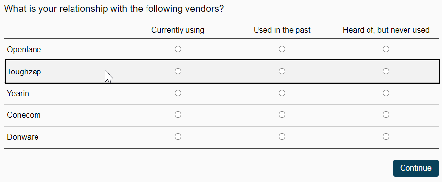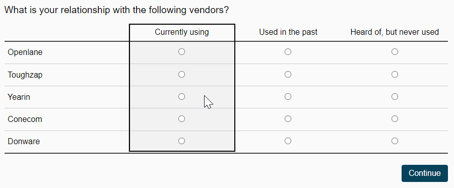 矩阵问题为一个按钮表,受访者通过点击按钮,选择他们的答案。选项将以多种不同的方式展现。要向矩阵添加行或列,请参阅本文。