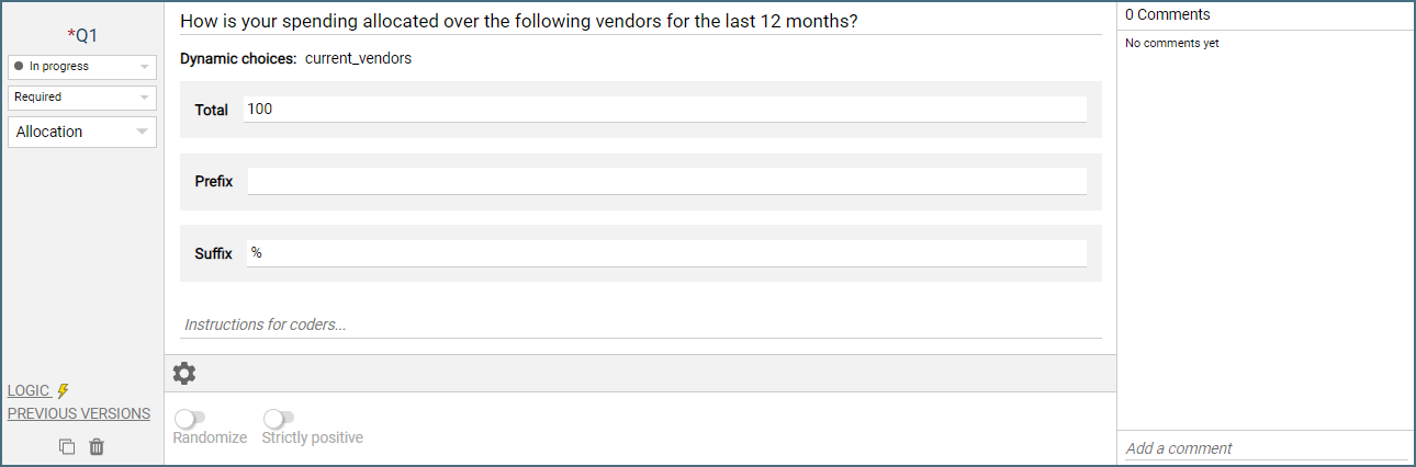 比重题类型将为受访者提供一列数字输入框,所有数字需要汇总为Total(总计)。这最常用于百分比分配,例如在询问关于支出比重的问题。